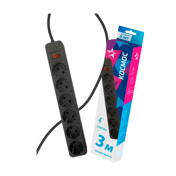 Сетевой фильтр Космос 6р.С/З 16A 3.0м ПВС 3x1мм² с выкл. черный (1/20)