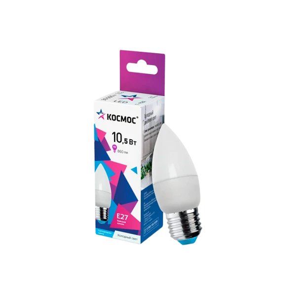 Светодиодная лампа КОСМОС LED 10.5Вт Свеча 220В E27 6500К LkecLED10.5wCNE2765 является аналогом лампы накаливания «свеча» 90 Вт. Для средней комнаты понадобится 3 таких лампочки.
