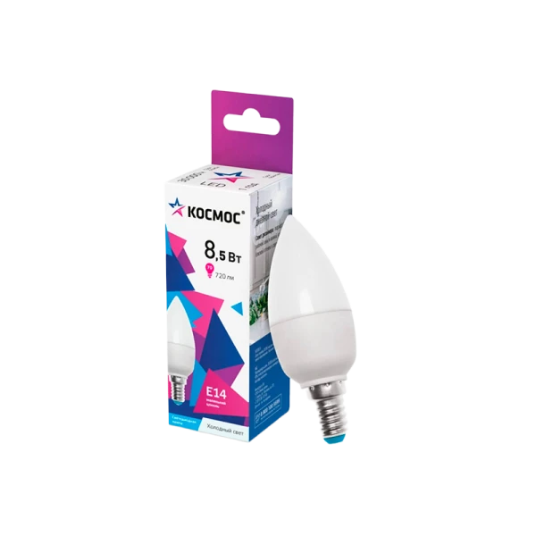 Светодиодная лампа КОСМОС LED 8.5Вт Свеча 220В E14 6500К LkecLED8.5wCNE1465 является аналогом лампы накаливания «свеча» 70 Вт. Для средней комнаты понадобится 3 таких лампочки.