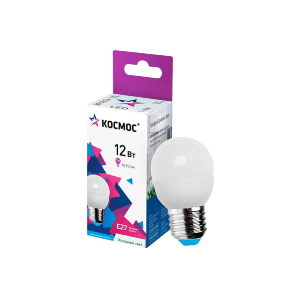 Светодиодная лампа КОСМОС LED 12Вт Шар 220В E27 6500К LkeLED12wGL45E2765 является аналогом лампы накаливания «шарик» 110 Вт. Для средней комнаты понадобится 2 таких лампочки.