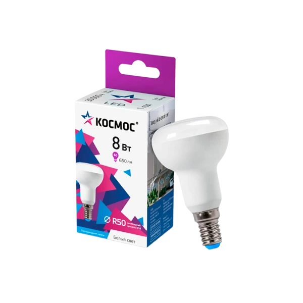 Светодиодная лампа КОСМОС LED 8Вт R50 220В E14 6500К, Lksm_LED8wR50E1465 является аналогом зеркальной лампы накаливания R50 80 Вт - для средней комнаты понадобится 4 таких лампочки. Направленный свет для встраиваемых светильников.