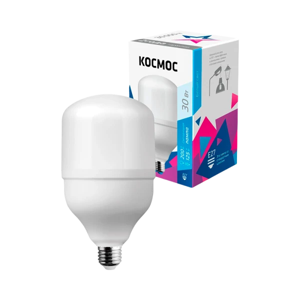 Светодиодная лампочка 30 Вт под стандартный цоколь Е27 для светильников 220В. По яркости заменяет лампы КЛЛ 45 Вт и ДРВ 125 Вт. Используется в купольных, консольных, и парковых светильниках, габариты лампы 80х135мм. Работает в диапазоне от 174В до 265В -