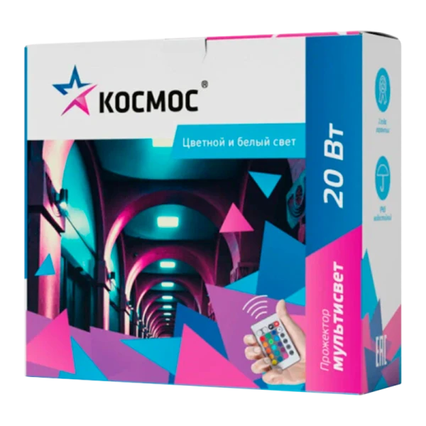 Прожектор светодиодный Космос с пультом RGB 20Вт 6500К IP65 1600лм 20 режимов работы КОСМОС K_PR5_LED_20RGB - это мощный и универсальный световой прибор, созданный компанией КОСМОС. Артикул K_PR5_LED_20RGB указывает на его модель. Прожектор оснащен светодиодными лампами с ярким белым светом 6500К и обеспечивает высокую световую отдачу в 1600 лм. Благодаря встроенному пульту ДУ, вы можете управлять 20 режимами работы, выбирать нужный цвет и интенсивность освещения. Прожектор Космос имеет защиту от влаги и пыли IP65, поэтому его можно безопасно использовать как внутри помещений, так и на улице. Светодиодный прожектор КОСМОС идеально подходит для создания яркого освещения во время проведения мероприятий, декорирования фасадов зданий, освещения садовых участков и множества других задач, где требуется надежное и эффективное освещение!