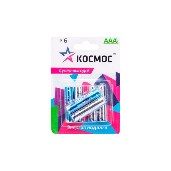 Щелочные (алкалиновые) батарейки Космос – в упаковке 6 шт - выгодная большая упаковка для розницы. Типоразмер батареек ААА также называют «мизиньчиковые» (на приборах-потребителях может обозначаться как LR03, R03, UM4). Работают как дорогие батарейки – по результатам независимых тестов показали результат сопоставимый