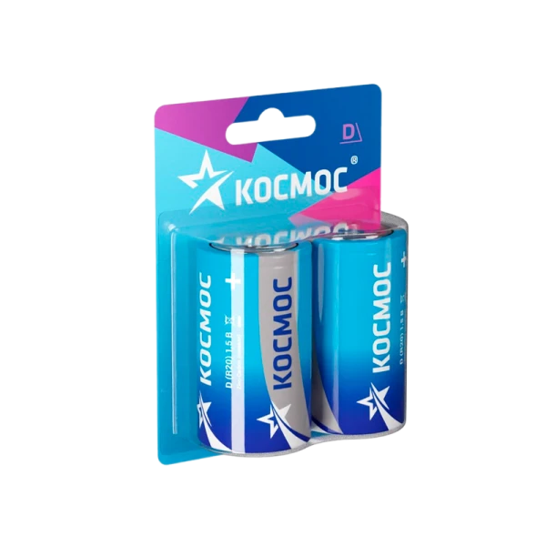 Солевые (цинк-углеродные) батарейки Космос – в упаковке 2 шт. Типоразмер батареек D также называют «большой бочонок»