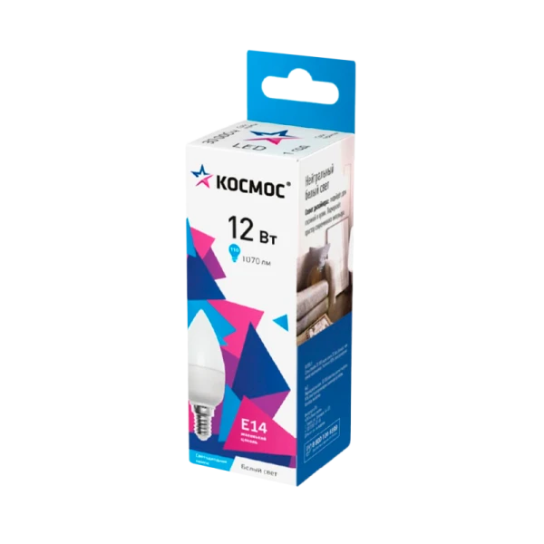 Лампа светодиодная Космос CN E14 12W 4500К 174-265V свеча матовая (1/10/80)