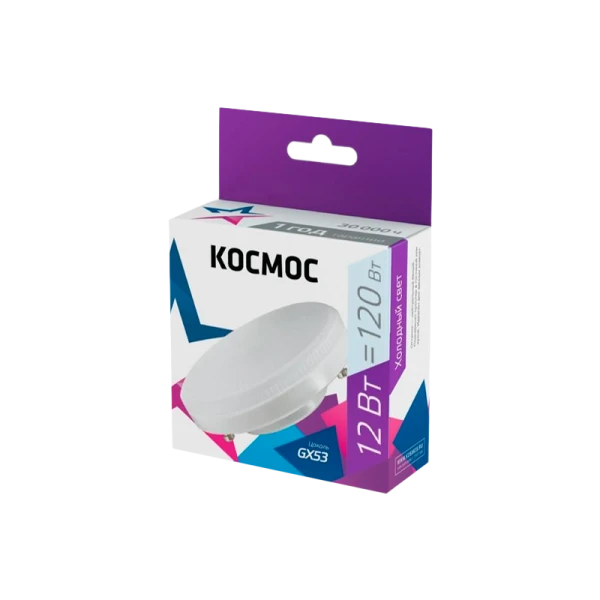 Светодиодная лампа КОСМОС LED 12Вт 220В GX53 6500K, является аналогом лампы накаливания 120 Вт. В основе лампы используются чипы от мирового лидера Epistar, что обеспечивает надежную