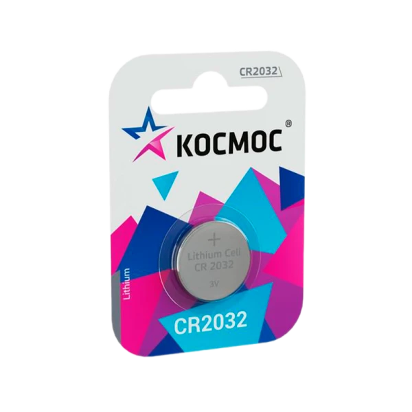 Миниатюрный литиевый элемент питания Космос CR2032 с длительным сроком хранения – до 10 лет. Высота: 3,2мм, диаметр 20мм.