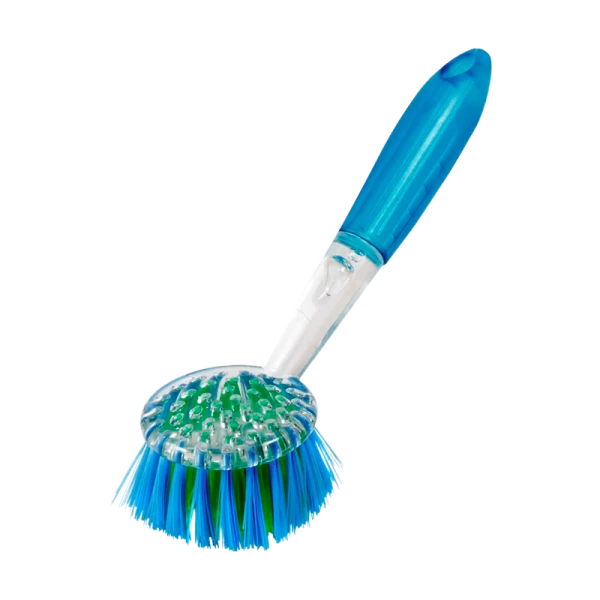 Щетка изготовлена из пластика и предназначена для мытья посуды; Ворс обладает средней жесткостью для качественного мытья загрязненных поверхностей.