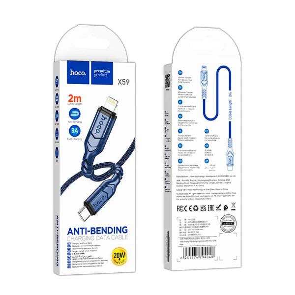 Кабель HOCO X59 Type-C (m)-Lightning (m) 2м 2.4A 20W нейлон синий
