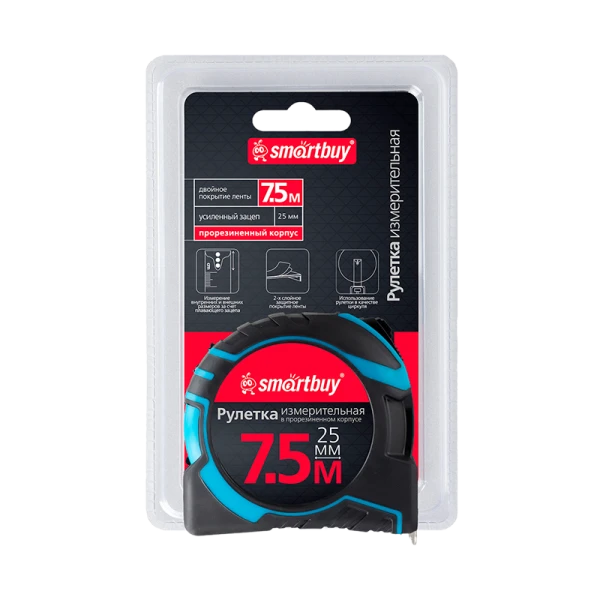 Высококачественная измерительная рулетка от бренда SmartbuyTools; Модель обладает длиною 7.5 метров и шириной 25 мм. Прорезиненный корпус защищает инструмент от ударов и повреждений, а усиленный зацеп обеспечивает удобство использования;