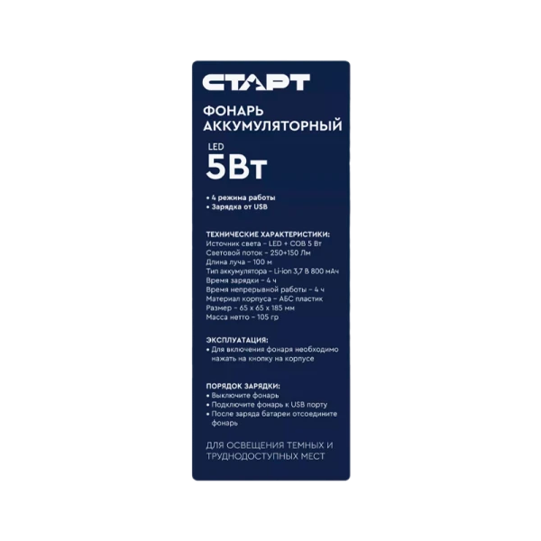 Аккумуляторный ручной фонарь Старт LHE 516-B1 - это идеальное сочетание удобства и функциональности для повседневного использования. Благодаря светодиодному источнику света, этот бытовой фонарик способен обеспечить яркое и равномерное освещение до 4 часов непрерывной работы. Фонарик с аккумулятором позволяет использовать его без необходимости постоянной замены батареек, что делает его экономичным и экологически чистым вариантом. Более того, возможность зарядки при помощи стандартного разъёма USB делает его очень удобным в использовании в домашних условиях или на улице.