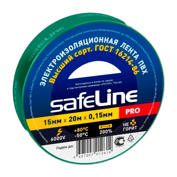 Изолента Safeline 15мм*20м ПВХ зеленого цвета предназначена для проведения всех видов электромонтажных работ: