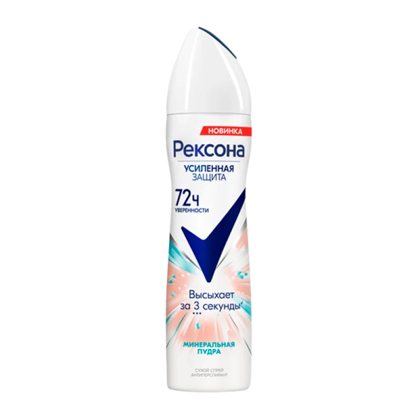 Чувствуйте только комфорт и уверенность в течение всего дня вместе с антиперспирантом-аэрозолем Rexona Минеральная пудра.