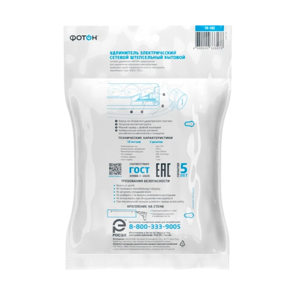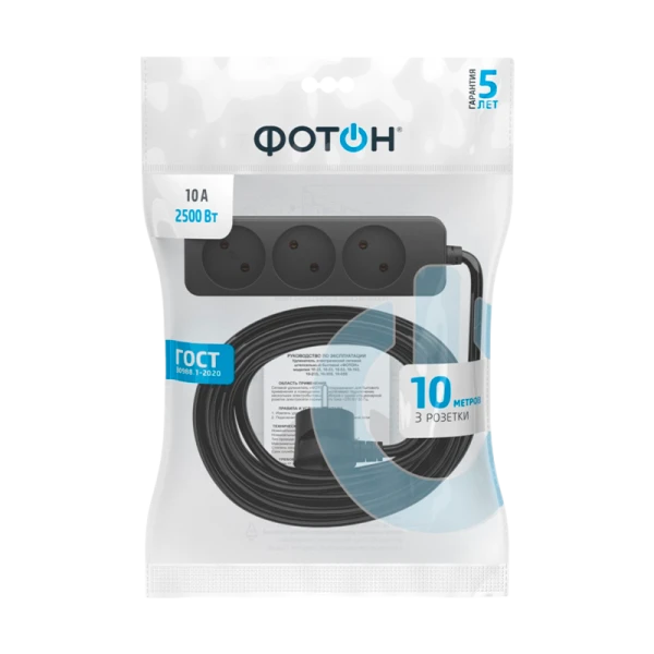 Удлинитель сетевой "ФОТОН" 10-103 - это простая, но надёжная и безопасная модель по самой выгодной цене. Предназначена для подключения электроприборов суммарной мощностью до 2500Вт. Колодка с 3 розетками и длиной провода 10 метров. Полностью соответствует нормам ГОСТ и ЕАС. Предоставляется безусловная гарантия 5 лет. Корпус изготовлен из термоустойчивого и ударопрочного пластика. Контактная группа из латуни обеспечивает высокую электропроводность и максимально плотный контакт со штырями вилок подключаемых приборов. Гнездовые контакты расположены под углом для одновременного подключения нескольких приборов. Подходят для подключения вилок российского и европейского стандарта. Провод ПВС с медной токопроводящей жилой и двойной ПВХ изоляцией устойчив к нагреву и обладает повышенной гибкостью. Удлинитель чёрного цвета идеально подходит для подключения приборов с проводами чёрного цвета, для использования в интерьерах тёмных тонов, а также при размещении на полу в помещениях, склонных к загрязнению.