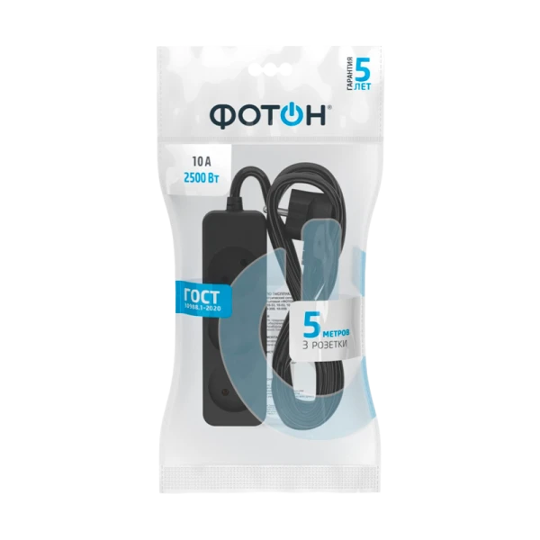 Удлинитель Фотон 10-53 3р.Б/З 10A 5.0м ПВС 2x0.75мм² черный (1/20)
