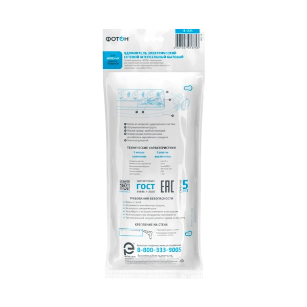 Удлинитель сетевой "ФОТОН" 16-55ES с заземлением предназначен для подключения электроприборов суммарной мощностью до 4000Вт. Оснащен выключателем, позволяющим обесточить все разъемы одним нажатием кнопки. Снабжены защитными шторками, прикрывающими контакты, для обеспечения дополнительной безопасности.
