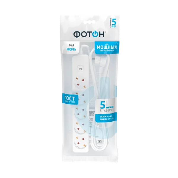 Удлинитель Фотон 16-55ЕS 5р.С/З 16A 5.0м с выкл. ПВС 3x1мм² белый (1/20)