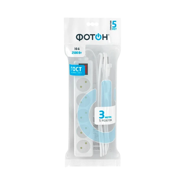 Удлинитель сетевой "ФОТОН" 10-35S оснащен выключателем, позволяющим обесточить все разъемы одним нажатием кнопки. Предназначена для подключения электроприборов суммарной мощностью до 2500Вт. Колодка с 5 розетками и длиной провода 3 метра. Полностью соответствует нормам ГОСТ и ЕАС. Предоставляется безусловная гарантия 5 лет. Корпус изготовлен из термоустойчивого и ударопрочного пластика. Контактная группа из латуни обеспечивает высокую электропроводность и максимально плотный контакт со штырями вилок подключаемых приборов. Гнездовые контакты расположены под углом для одновременного подключения нескольких приборов. Подходят для подключения вилок российского и европейского стандарта. Провод ПВС с медной токопроводящей жилой и двойной ПВХ изоляцией устойчив к нагреву и обладает повышенной гибкостью. Удлинитель белого цвета подходит для большинства ситуаций домашнего использования.