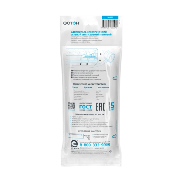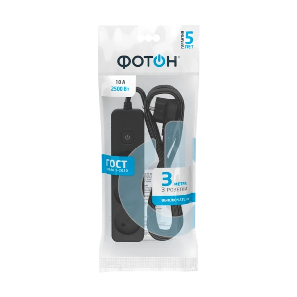 Удлинитель сетевой "ФОТОН" 10-33S оснащен выключателем, позволяющим обесточить все разъемы одним нажатием кнопки. Предназначена для подключения электроприборов суммарной мощностью до 2500Вт. Колодка с 3 розетками и длиной провода 3 метра. Полностью соответствует нормам ГОСТ и ЕАС. Предоставляется безусловная гарантия 5 лет. Корпус изготовлен из термоустойчивого и ударопрочного пластика. Контактная группа из латуни обеспечивает высокую электропроводность и максимально плотный контакт со штырями вилок подключаемых приборов. Гнездовые контакты расположены под углом для одновременного подключения нескольких приборов. Подходят для подключения вилок российского и европейского стандарта. Провод ПВС с медной токопроводящей жилой и двойной ПВХ изоляцией устойчив к нагреву и обладает повышенной гибкостью. Удлинитель чёрного цвета идеально подходит для подключения приборов с проводами чёрного цвета, для использования в интерьерах тёмных тонов, а также при размещении на полу в помещениях, склонных к загрязнению.