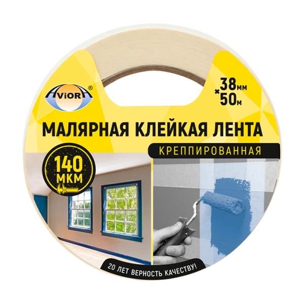 Малярная креппированная клейкая лента Aviora 38мм*50м применяется: при проведении малярных, покрасочных, штукатурных и любых других видов работ, где требуется добиться ровных линий, а также не допустить смешивание различных цветов краски. Для заклеивания щелей на окнах, для крепежа полотен на дверях и т.д.