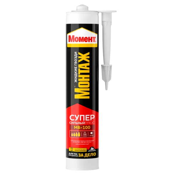 Момент Монтаж Суперсильный МВ-100 белый обладает высокой начальной силой склеивания (100 кг/м2) и отлично подходит для различных ремонтных работ; Клей Момент Монтаж Суперсильный МВ-100 белый применяется для крепления тяжелых конструкций из дерева, металла, ПВХ, керамики, ДСП, МДФ, гипсокартона, пробки, полистирола, пенопласта, гипса и других материалов.
