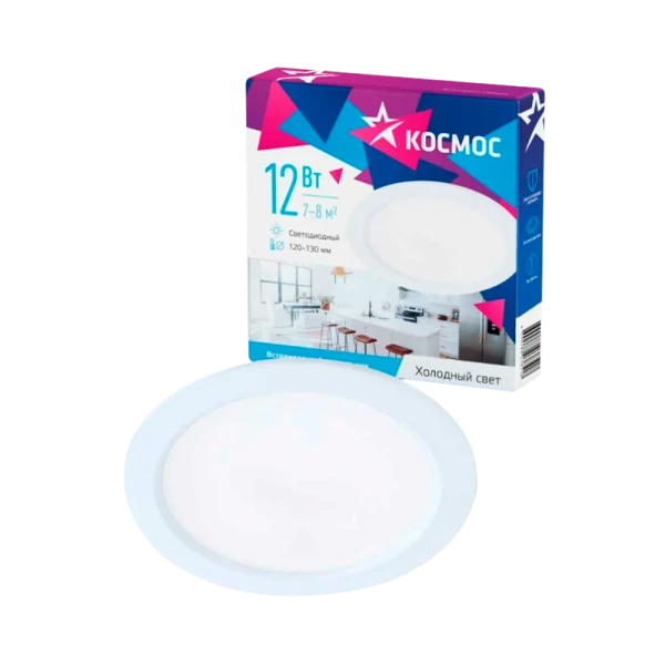 Светодиодная панель КОСМОС круглая, цвет белый, DownL 12W, 180-265В, 6400K, KDownL12W6400K под стандартное посадочное место 120-130мм. Осветит пространство площадью 7-8 м². Совместима с любыми типами подвесных потолков: натяжных, реечных, из ГКЛ и др.