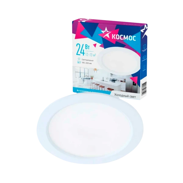 Светодиодная панель КОСМОС круглая, цвет белый, DownL 24W, 180-265В, 4000K, KDownL24W6400K под стандартное посадочное место 185-200мм. Осветит пространство площадью 12-13 м2. Совместима с любыми типами подвесных потолков: натяжных, реечных, из ГКЛ и др. Стабильный свет без падения яркости в течение всего срока службы (30 000 часов) - за счет использования светодиодов известных производителей.