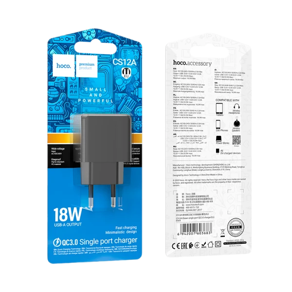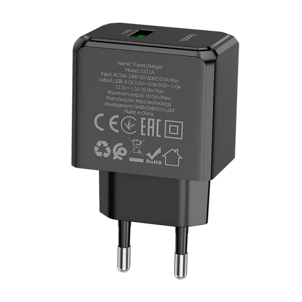 Сетевое З/У HOCO CS12A 1USB 3.0A 18W QC3.0 черный (1/28/168)