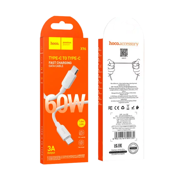 Кабель HOCO X96 Type-C (m)-Type-C (m) 1.0м 3.0A 60W силикон белый;