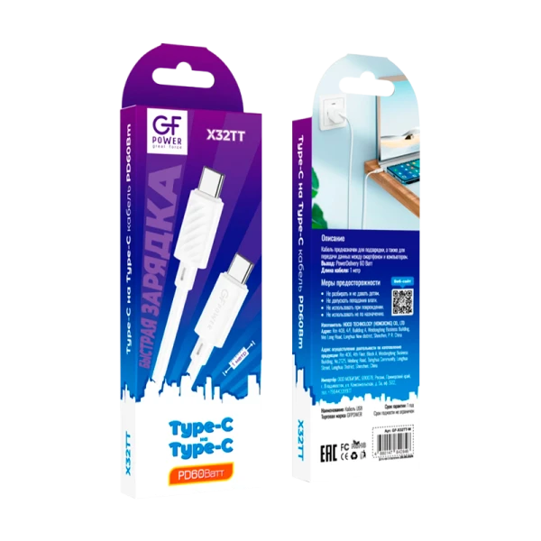 Кабель GFPower X32TT Type-C (m)-Type-C (m) 1м 60W ПВХ белый (1/30/420)