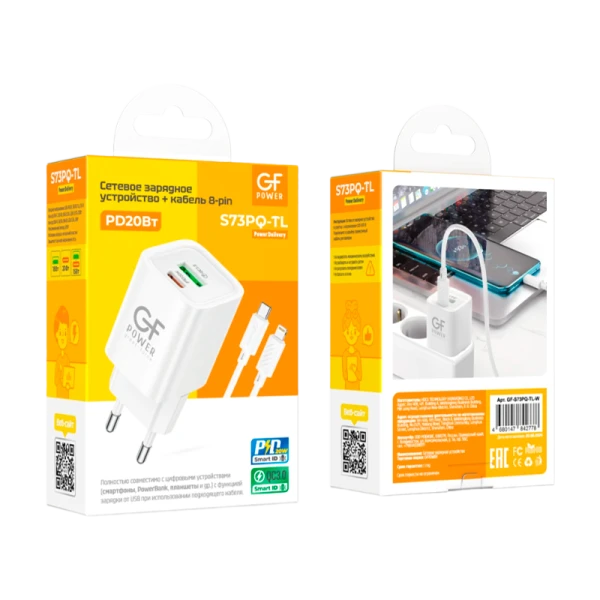 Сетевое З/У GFPower S73PQ-TL 1USB+1Type-C 20W PD,QC с кабелем Type-C-Lightning белый; Полностью совместимо с цифровыми устройствами (смартфоны, PowerBank, планшеты и др.) с функцией зарядки от USB при использовании подходящего кабеля;
