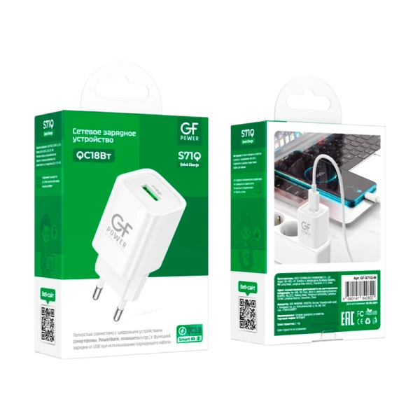 Сетевое З/У GFPower S71Q-UM 1USB 18W QC3.0 с кабелем microUSB белый; Полностью совместимо с цифровыми устройствами (смартфоны, PowerBank, планшеты и др.) с функцией зарядки от USB при использовании подходящего кабеля. Поддерживает выходной ток до 12 Вольт для быстрой зарядки мощностью 18 Ватт;