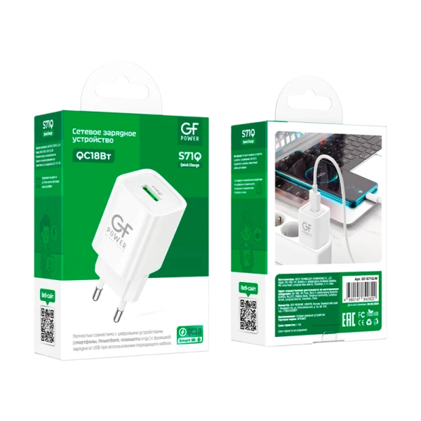 Сетевое З/У GFPower S71Q 1USB 18W QC3.0 белый;