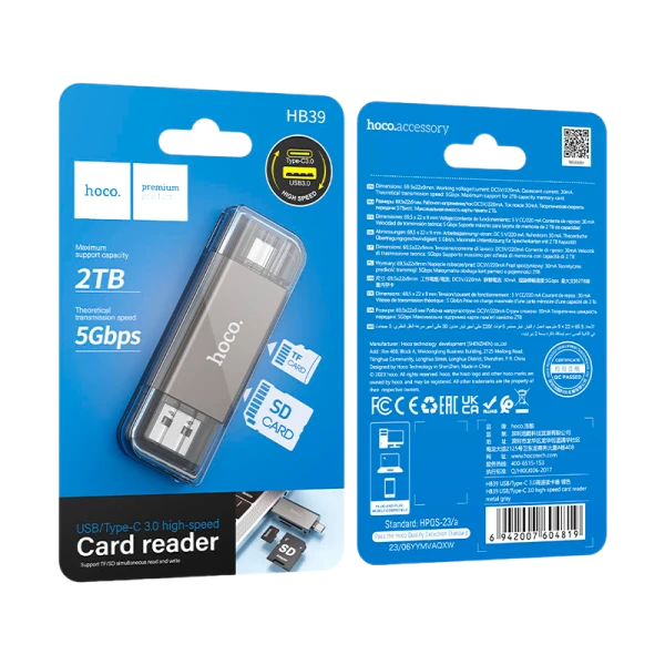 HB39, кард ридер, USB-A + Type-C 3.0 на SD + TF, поддержка карт памяти до 2Tb, 5Gbps скорость передачи;