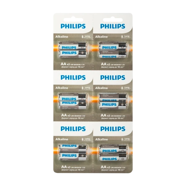 Батарейка Philips Entry LR6 AA BL12 (2*6) Alkaline 1.5V отрывные; Питает все устройства с высоким энергопотреблением. Долговечные и надежные элементы питания для повседневных устройств, таких как часы и радиоприемники. Базовые щелочные батареи Philips обеспечивают максимальное качество для стандартных задач.