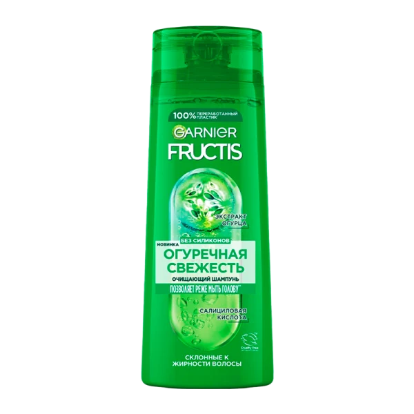 Шампунь, продлевающий свежесть волос. Специально создан для волос, склонных к жирности и быстрому загрязнению. Благодаря уникальной комбинации экстракта огурца и витаминов B3 и B6 шампунь Fructis Огуречная свежесть надолго очищает волосы и кожу головы, способствует укреплению волосяных луковиц и росту более сильных волос. Активный концентрат фруктов в составе обеспечивает антиоксидантную защиту, делает волосы плотными и блестящими.