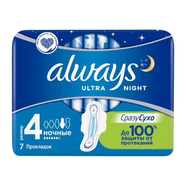 Гигиенические прокладки созданы для обильных выделений в ночное время (каждая прокладка толщиной 3 мм в индивидуальной упаковке, что позволяет взять ее с собой). Always Ultra обеспечивают такую же высокую защиту, как и прокладки обычной толщины.