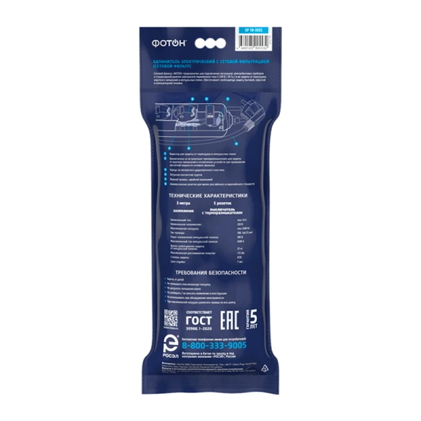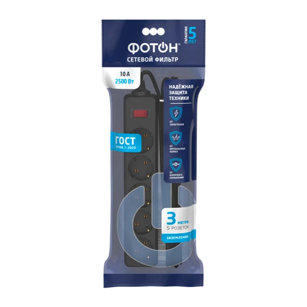 Сетевой фильтр предназначен для подключения нескольких электроприборов и их защиты от перегрузки, короткого замыкания и импульсных помех. Обеспечивает необходимую защиту бытовой, офисной и компьютерной техники. Варистор для защиты от перегрузки и импульсных помех. Выключатель со встроенным терморазмыкателем для защиты от коротких замыканий и отключения устройств при превышении расчетной мощности сетевого фильтра.