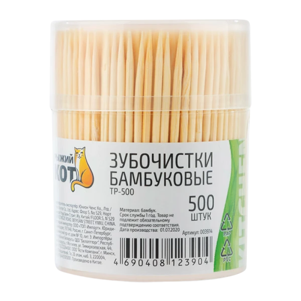 Бамбуковые зубочистки Рыжий кот TP-500, 500 шт предназначены для гигиены полости рта. Позволяют легко удалить остатки еды между зубами, поэтому отличаются практичностью. Не содержат вредных веществ, за счет чего безопасны в использовании. Благодаря прочной упаковке зубочистки Рыжий кот защищены от пыли и грязи.