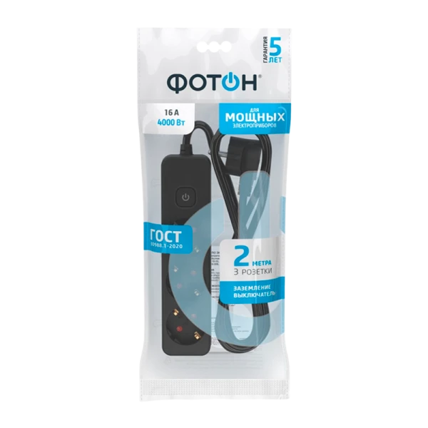 Удлинитель сетевой "ФОТОН" 16-23ES с заземлением предназначен для подключения электроприборов суммарной мощностью до 4000Вт. Оснащен выключателем, позволяющим обесточить все разъемы одним нажатием кнопки. Снабжены защитными шторками, прикрывающими контакты, для обеспечения дополнительной безопасности.