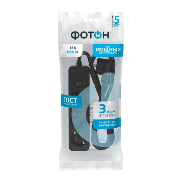 Удлинитель сетевой "ФОТОН" 16-33ES с заземлением предназначен для подключения электроприборов суммарной мощностью до 4000Вт. Оснащен выключателем, позволяющим обесточить все разъемы одним нажатием кнопки. Снабжены защитными шторками, прикрывающими контакты, для обеспечения дополнительной безопасности.