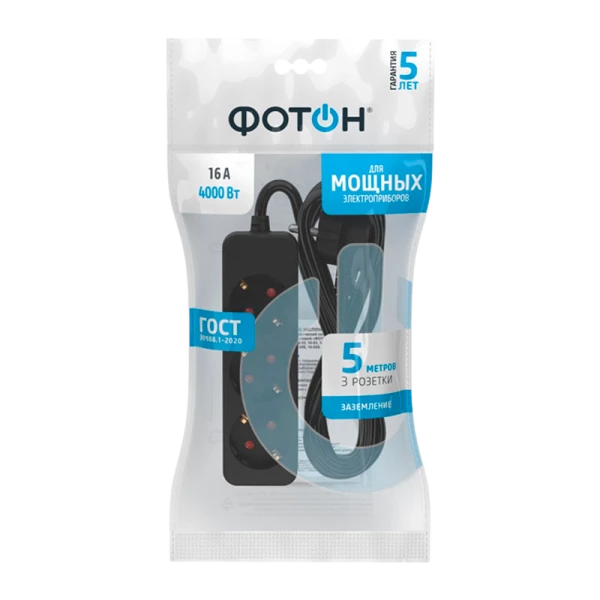 Удлинитель сетевой "ФОТОН" 16-53E с заземлением предназначен для подключения электроприборов суммарной мощностью до 4000Вт. Снабжены защитными шторками, прикрывающими контакты, для обеспечения дополнительной безопасности. Колодка с 3 розетками и длиной провода 5 метров. Полностью соответствует нормам ГОСТ и ЕАС. Корпус изготовлен из термоустойчивого и ударопрочного пластика. Контактная группа из латуни обеспечивает высокую электропроводность и максимально плотный контакт со штырями вилок подключаемых приборов. Гнездовые контакты расположены под углом для одновременного подключения нескольких приборов. Подходят для подключения вилок российского и европейского стандарта. Провод ПВС с медной токопроводящей жилой и двойной ПВХ изоляцией устойчив к нагреву и обладает повышенной гибкостью. Удлинитель чёрного цвета идеально подходит для подключения приборов с проводами чёрного цвета, для использования в интерьерах тёмных тонов, а также при размещении на полу в помещениях.