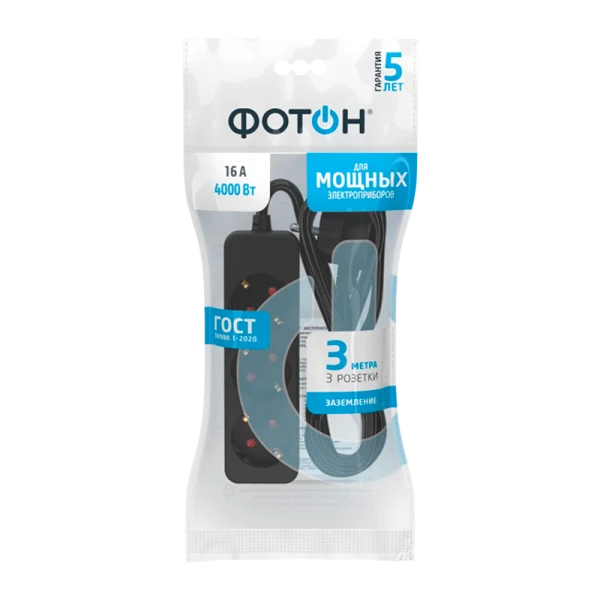 Удлинитель сетевой "ФОТОН" 16-33E с заземлением предназначен для подключения электроприборов суммарной мощностью до 4000Вт. Снабжены защитными шторками, прикрывающими контакты, для обеспечения дополнительной безопасности. Колодка с 3 розетками и длиной провода 3 метра. Полностью соответствует нормам ГОСТ и ЕАС. Предоставляется безусловная гарантия 5 лет. Корпус изготовлен из термоустойчивого и ударопрочного пластика. Контактная группа из латуни обеспечивает высокую электропроводность и максимально плотный контакт со штырями вилок подключаемых приборов. Гнездовые контакты расположены под углом для одновременного подключения нескольких приборов. Подходят для подключения вилок российского и европейского стандарта. Провод ПВС с медной токопроводящей жилой и двойной ПВХ изоляцией устойчив к нагреву и обладает повышенной гибкостью. Удлинитель чёрного цвета идеально подходит для подключения приборов с проводами чёрного цвета, для использования в интерьерах тёмных тонов;