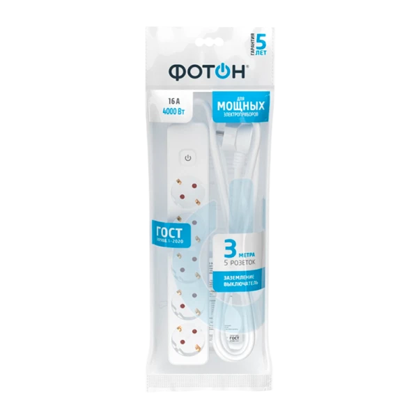 Удлинитель сетевой "ФОТОН" 16-35ES с заземлением предназначен для подключения электроприборов суммарной мощностью до 4000Вт. Оснащен выключателем, позволяющим обесточить все разъемы одним нажатием кнопки. Снабжены защитными шторками, прикрывающими контакты, для обеспечения дополнительной безопасности.
