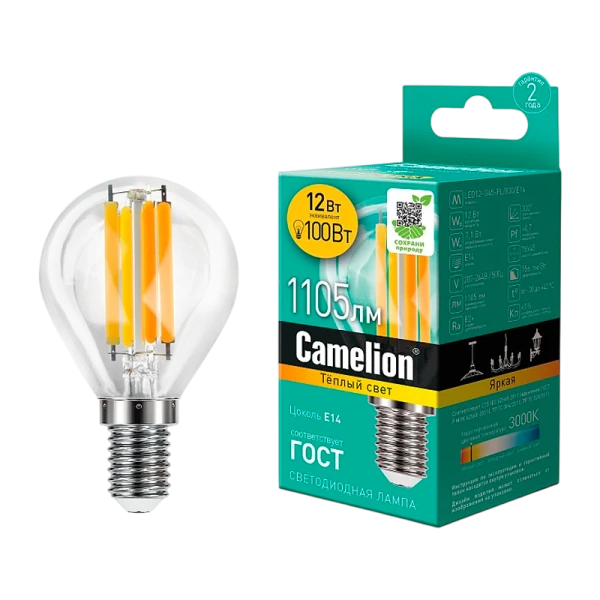 Светодиодная лампа Camelion LED12-G45-FL/830/E14, мощностью 12Вт, идеально подходит для освещения жилых, офисных и коммерческих помещений. Стабильное освещение благодаря качественным светодиодам. СДЛ Camelion - это инновационное решение, разработанное на основе новейших светодиодных технологий (LED). Встроенный источник питания позволяет использовать СДЛ Camelion в стандартных патронах.