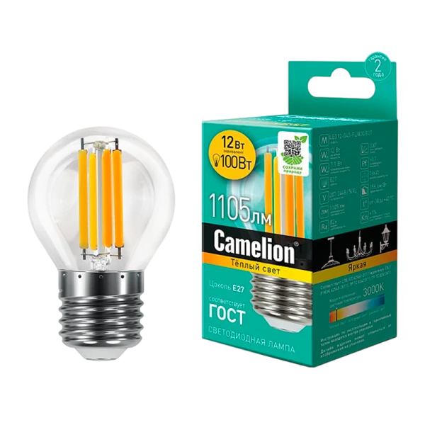 Лампа светодиодная филамент Camelion G45 E27 12W 3000К 207-244V шар прозрачная (1/10/100)