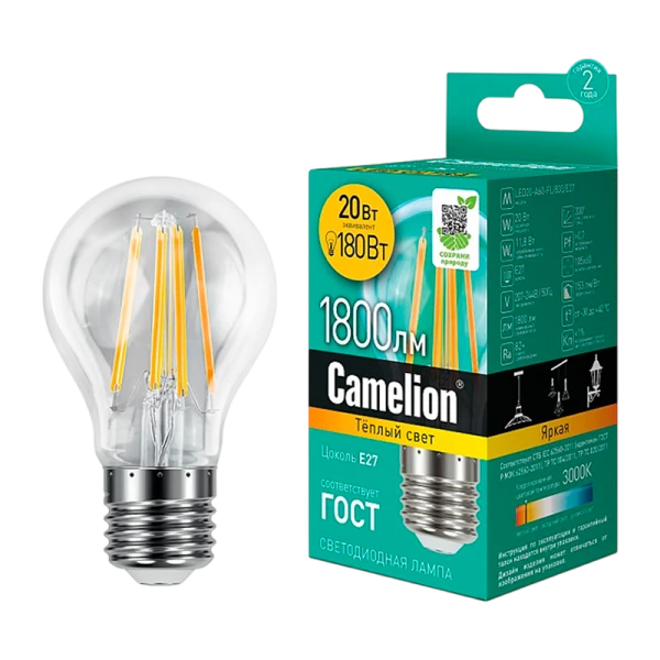 Лампа светодиодная филамент Camelion A60 E27 20W 4500К 207-244V груша прозрачная (1/10/100)