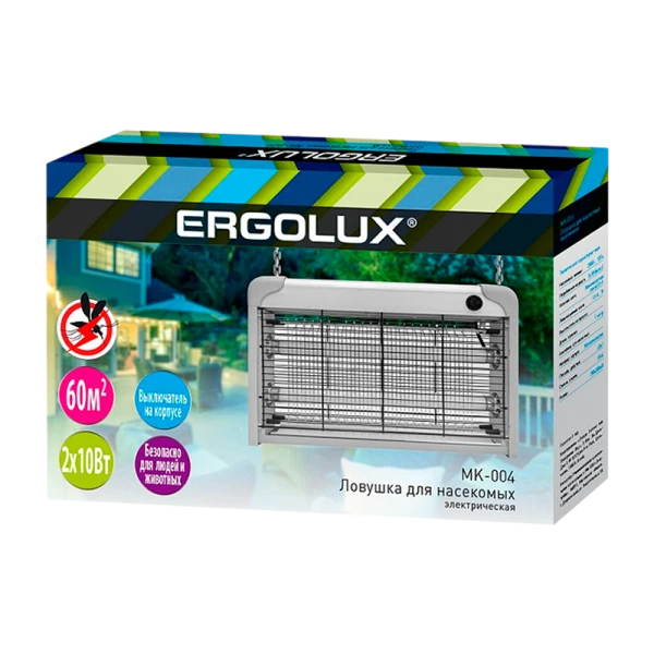 Антимоскитный светильник Ergolux MK-004 - это надежное средство борьбы с комарами и другими летающими насекомыми. Он излучает ультрафиолетовое свечение, которое привлекает насекомых, после чего они погибают, касаясь металлической решетки под безопасным для человека напряжением. Этот светильник идеально подходит для использования как внутри помещений, так и на открытом воздухе под навесом. Безвреден для человека. В комплекте имеются цепи для подвеса и контейнер для москитов. Выключатель на корпусе.
