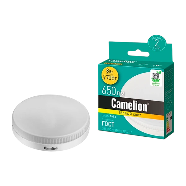 Лампа светодиодная Camelion GX53 8W 3000К 170-265V таблетка матовая (1/5/100)